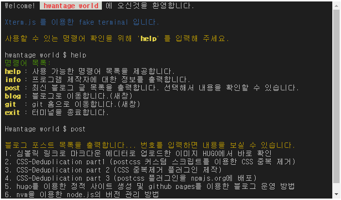 Xterm.js 를 이용하여 웹 사이트에 fake terminal 을 구현합니다.