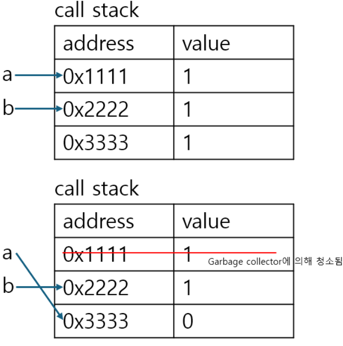 원시타입을 선언하여 값을 할당하면 call stack의 주소를 할당하고 값을 저장한후 변수에 주소를 가르키도록 한다.