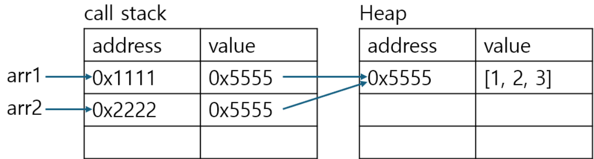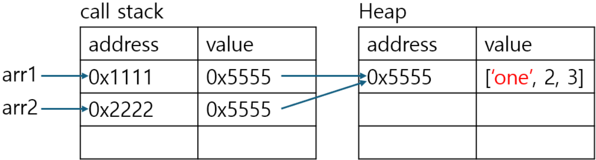 arr1[0] = ‘one’; 으로 arr1의 값 변경을 시도하면 heap 메모리 영역의 값을 변경하게 된다. 즉, 메모리 영역의 값이 변경 되었으므로 불변성이 깨진다. 참조 타입은 mutable 하다.