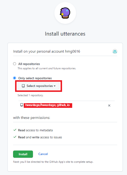 이후 등장하는 화면에서 블로그를 운영중인 repository를 선택하세요.