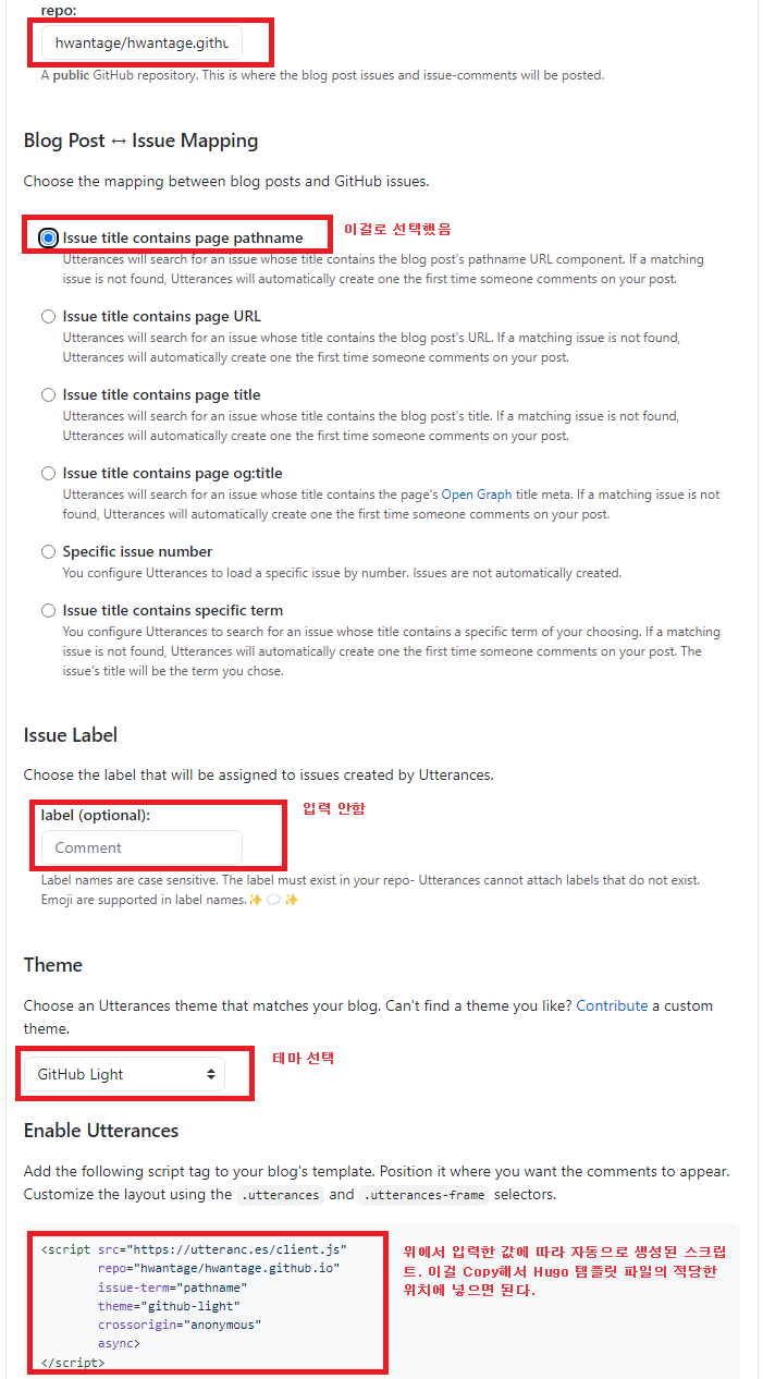 다시 https://utteranc.es/ 사이트에서 Configuration 항목 하위의 input 상자에 적절한 값을 입력하면 스크립트가 생성됩니다.
